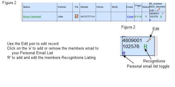 Click on the 'e' in the Edit box of the Members Listing to toggle a members email to your Personal Email List (See Figure 2 above)