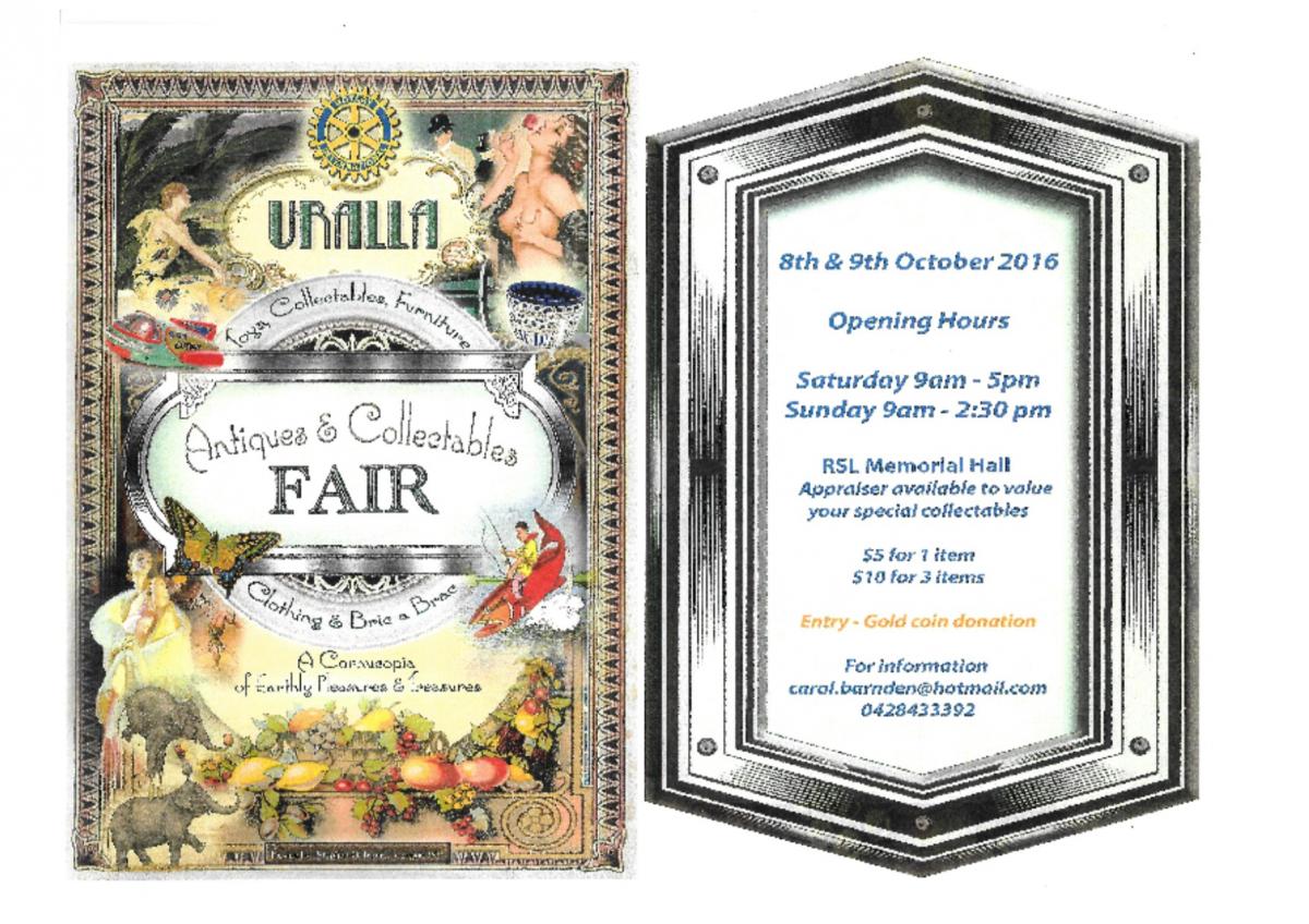 The Rotary Club of Uralla is holding their annual antique fair on the weekend 8/9 October in the RSL Memorial Hall.